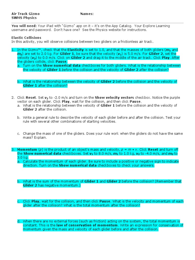 Click Reset. Check That The Elasticity Is Set To 1.0. Turn Off Show Numerical Data For Both Gliders / Air Track Gizmo 1 Collision Momentum : And elasticity turn off show numerical data for both gliders.